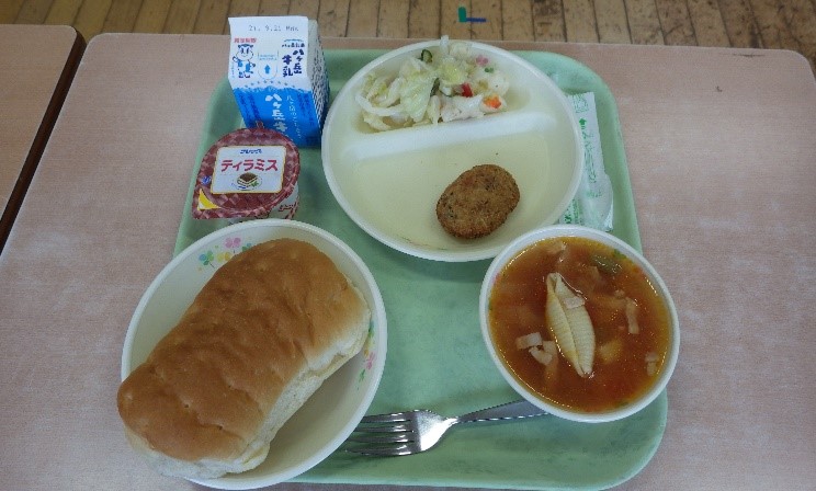 山梨県立ふじざくら支援学校 > 分掌 > 保健部 > 9月14日は 『イタリア料理献立』でした。 2021年9月16日カテゴリー: 分掌 保健部 9月14日は 『イタリア料理献立』でした。 1学期から続く、「世界の料理給食」。9月14日はイタリア料理献立でした。 イタリアの田舎料理の代表である、ミネストローネは、「具だくさんのスープ」という意味がある、野菜たっぷりのスープです。 ティラミスは、コーヒーをしみこませたビスケットの上に、マスカルポーネチーズ等を重ねた、少し大人なデザートです。イタリアでは甘く、柔らかいものを「ドルチェ」と呼ぶそうです。食後のドルチェを楽しみ、イタリアにいるかのような気分を味わっていました。 《イタリア料理献立》 フォカッチャ ミネストローネ ミラノ風カツレツ イタリアンサラダ ティラミス 牛乳