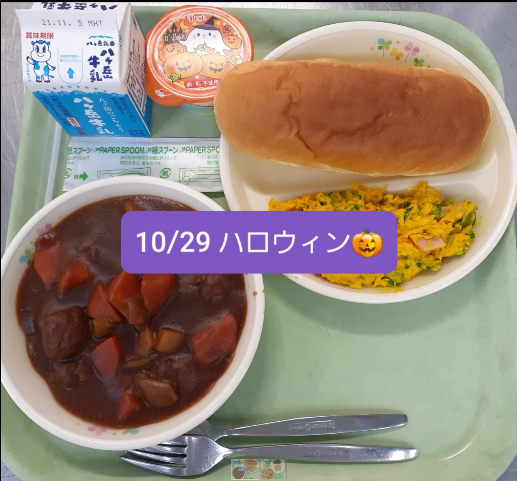 10月31日ハロウィンにちなんで、10月29日の給食は、「ハロウィン献立」でした。ハロウィンといえば「かぼちゃ」! 「かぼちゃサラダ」と「パンプキンババロア」のかぼちゃづくしの給食でした。