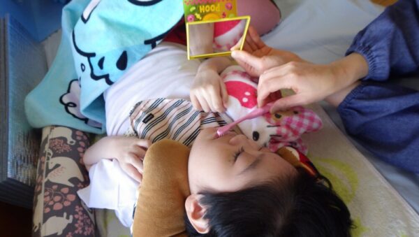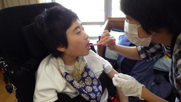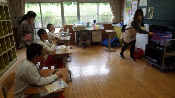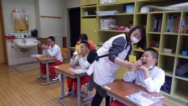 大会事務局から送られてきたDVDを観ながら、正しい歯みがきの方法について学びました。鏡を使って正しいブラッシングを確認した後、デンタルフロスにもチャレンジしました。素晴らしかったのは、デンタルフロスを持ったとたん、きちんと使用することができている人が多かったことです!「歯と歯の間の隙間から取れた1mgの歯垢の中には、2億から3億の細菌がいる!」と聞いた時には、みんなで驚きました。今回学習したポイントを毎日の歯みがきにも生かして歯と口の健康をキープしましょう!