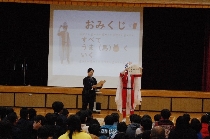 始業式では、校長先生から新年を迎えたことや今年の干支についてのお話がありました。今年は午(うま)年です。フジザックマンが引いたおみくじには、「すべてうま(馬)くいく」という言葉が添えられており、児童生徒は前向きな気持ちで3学期をスタートすることができました。3学期は、1年間のまとめの大切な学期です。子どもたちが目標をもって毎日を大切に過ごし、心も体も大きく成長していくことができるよう児童生徒と一緒に取り組んでいきたいと思います。