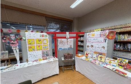 図書室内にはお正月をテーマにした特設コーナーが設けられ、初詣に関することや、お正月のあそびなどが紹介されました。児童生徒たちは、設置された鳥居の鈴を鳴らしたり、はねつき・こま・ふくわらい・かるたといったあそび道具を手にしたりしながら、日本の伝統的な新年の過ごし方を体験的に楽しむことができたようです。