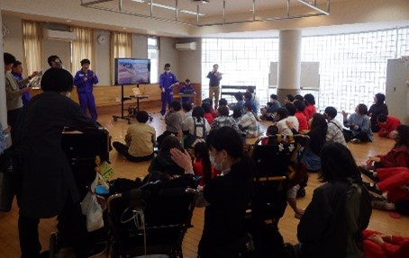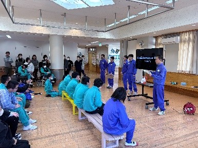 お昼休みには、絵本読み聞かせ会が開催され、小学部向けの会では「おもちのきもち」という本を、中学部・高等部向けの会には「おもち!」という本を読み聞かせしてくれました。どちらの本もお餅に関するお話で、図書委員の生徒は掛け声や楽器でたのしく盛り上げ、絵本を読んでくれました。
